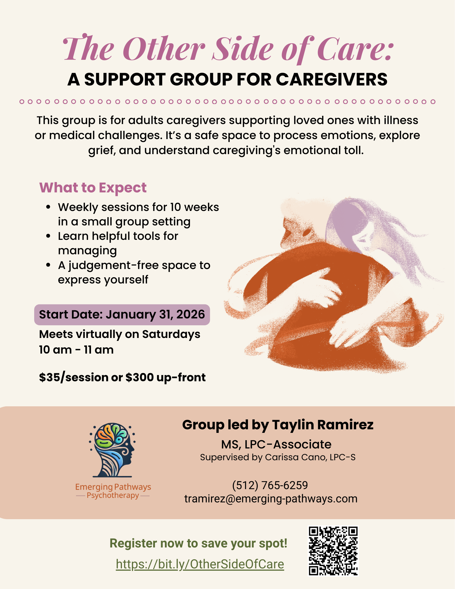 Together, we’ll explore the emotional toll of caregiving, build tools for resilience and boundaries, and reconnect you to you—the person beyond the caregiving role. Come as you are.